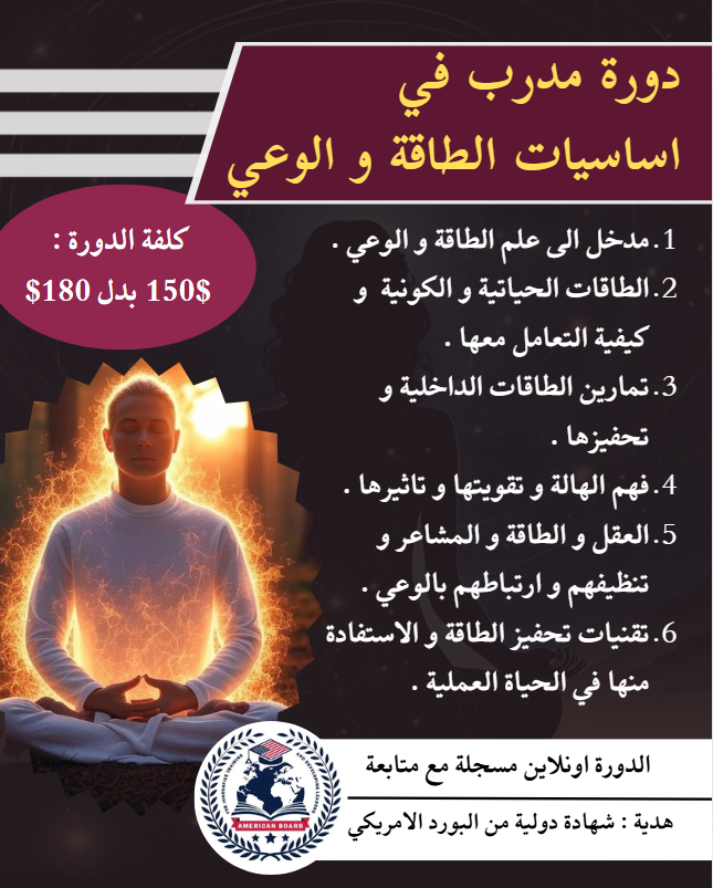 في هذه الدورة سنقوم بشرح اساسيات الطاقة الحيوية . تعتبر هذه الدورة الخطوة الأولى في علم الوعي و الطاقة و التطوير الذاتي . لا بل هي الخطوة التي تخطوها للدخول لهذا العالم الواسع .
