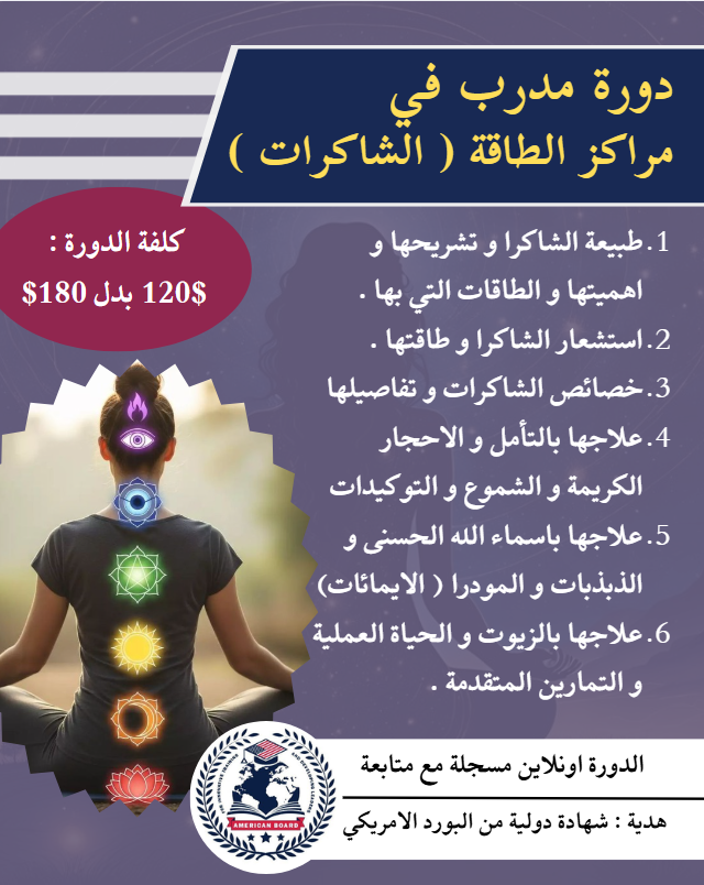 مراكز الطاقة في الجسم . او ما تسمى بالشاكرات (عجلات الطاقة) . هي الامراكو اللي تأثر و تتاثر في حياتنا و تعمل ادارة لحالتنا الصحية و النفسية و العقلية و الحياتية . من خلال هيدي الدورة انت لح تكون مدرب و معالج لهيدي المراكز و محنرف في توازنها و علاجها و ترميمها …
