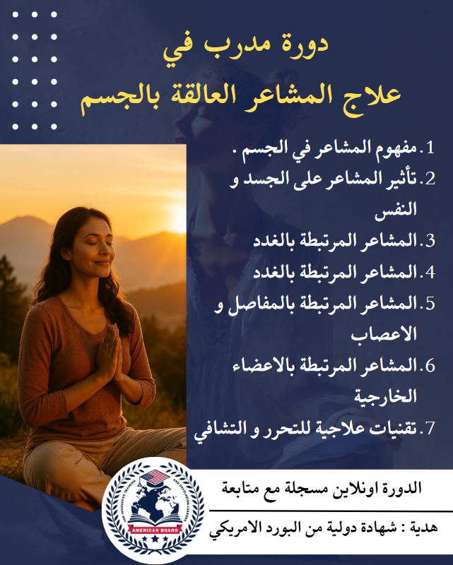 – شهادة دولية من البورد الامريكي ( مدرب في العلاج المشاعري للمشاعر العالقة بالجسم ).